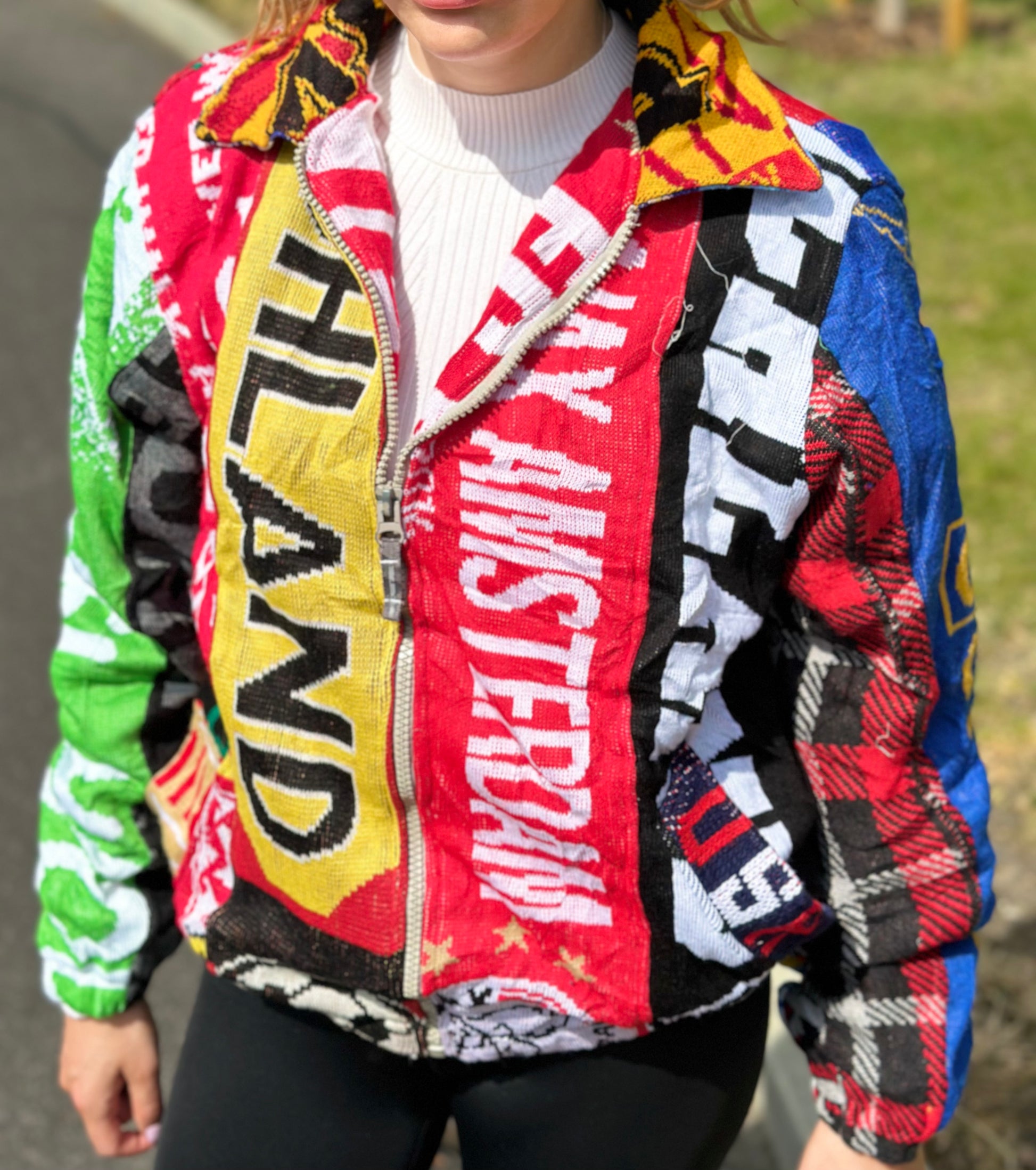 Made from entirely reclaimed materials, this includes the scarf outer, the lining and the zip. This piece has a bomber jacket silhouette is totally unique.