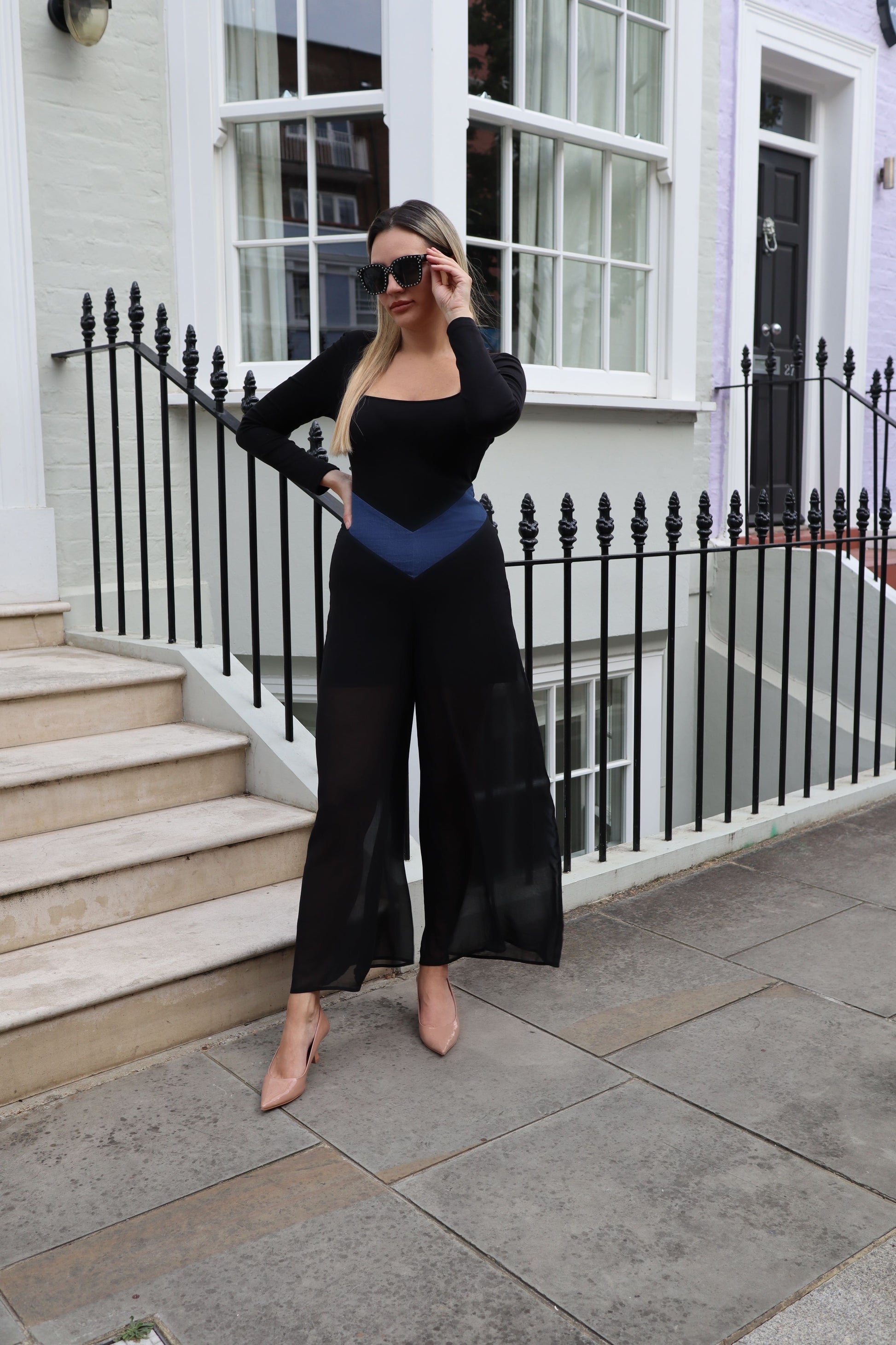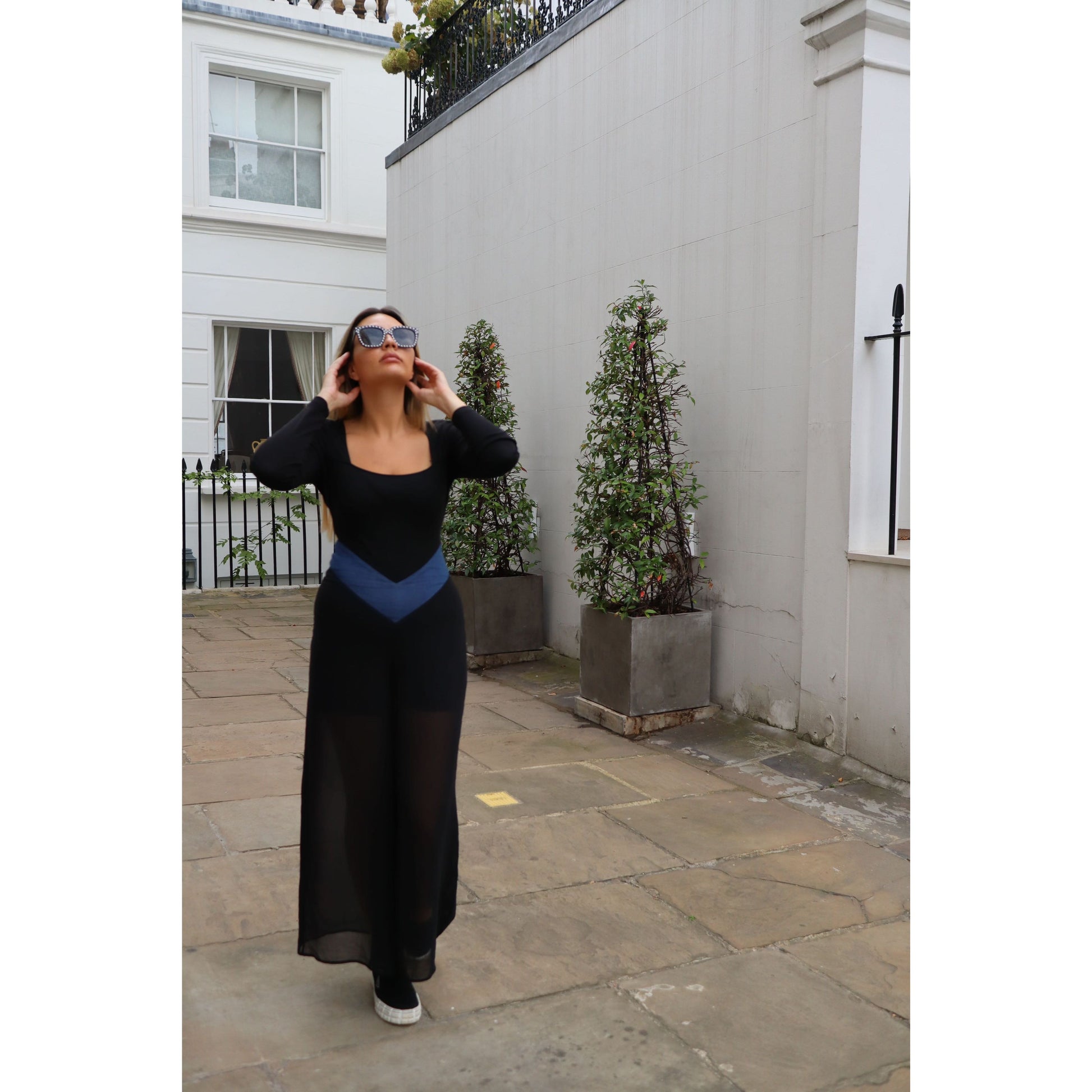 Sheer Palazzo Perfection: The lower half of our jumpsuit boasts sheer palazzo trousers with layered shorts beneath, creating a chic and stylish silhouette that's both trendy and timeless.